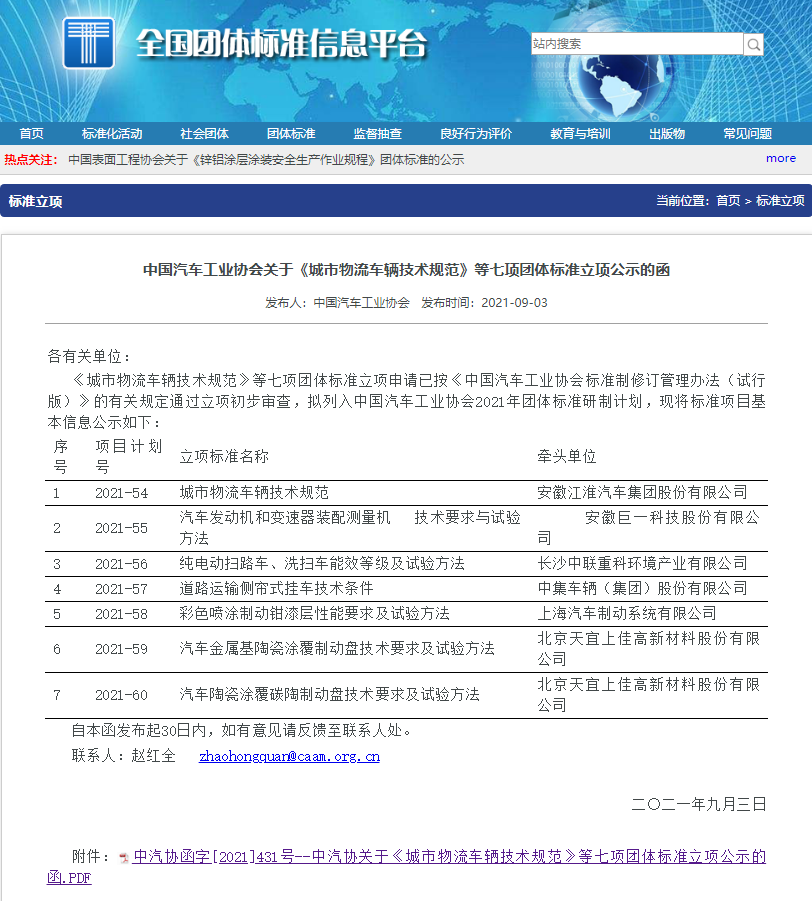 近日,中國汽車工業(yè)協(xié)會發(fā)布了《中國汽車工業(yè)協(xié)會關(guān)于2021年第六批團體標準立項通知的函》(中汽協(xié)函字【2021】487號)。通知指出,經(jīng)專家評審、審查、公示,北京天宜上佳高新材料股份有限公司(以下簡稱“天宜上佳”)申請的《汽車金屬基陶瓷涂覆制動盤技術(shù)要求及試驗方法》和《汽車陶瓷涂覆碳陶制動盤技術(shù)要求及試驗方法》 2項團體標準制定項目成功獲批立項。