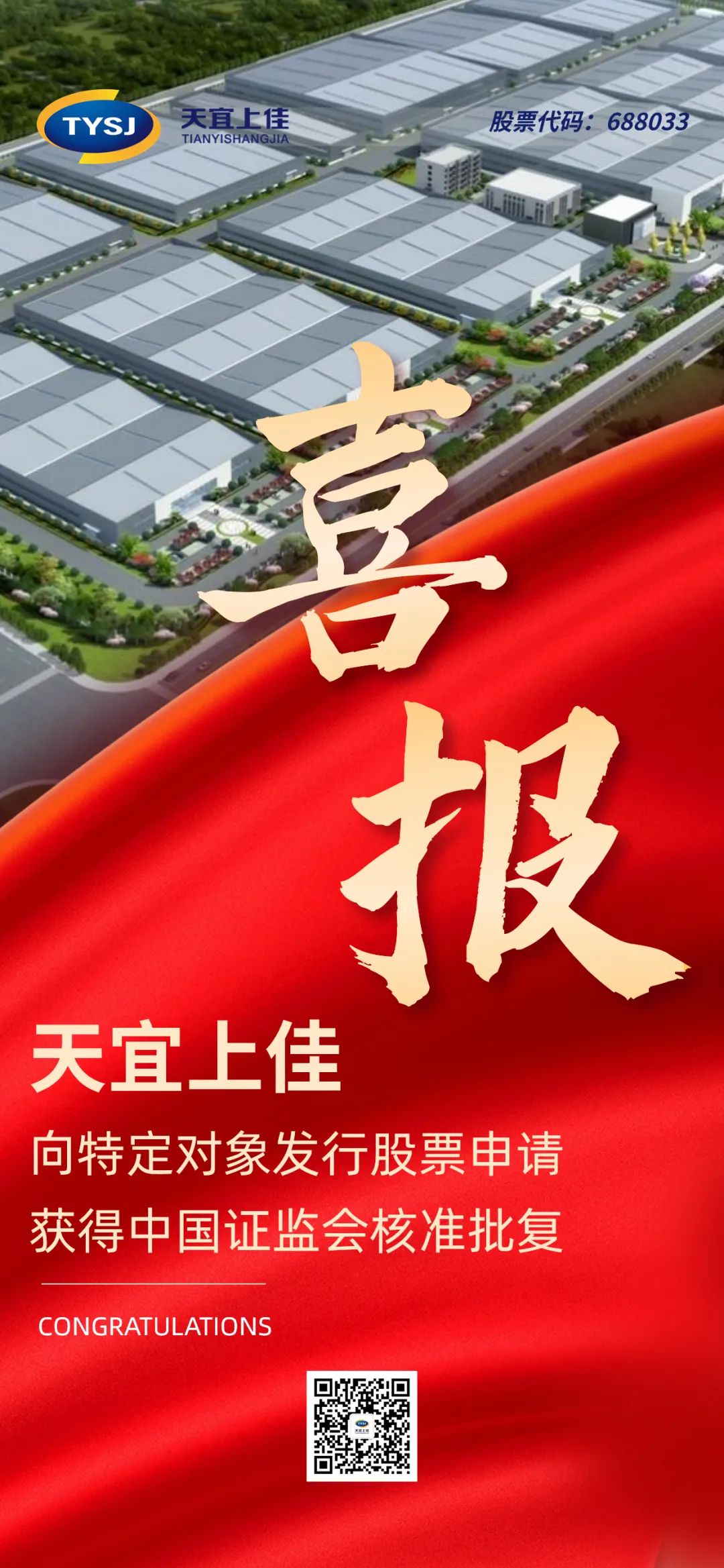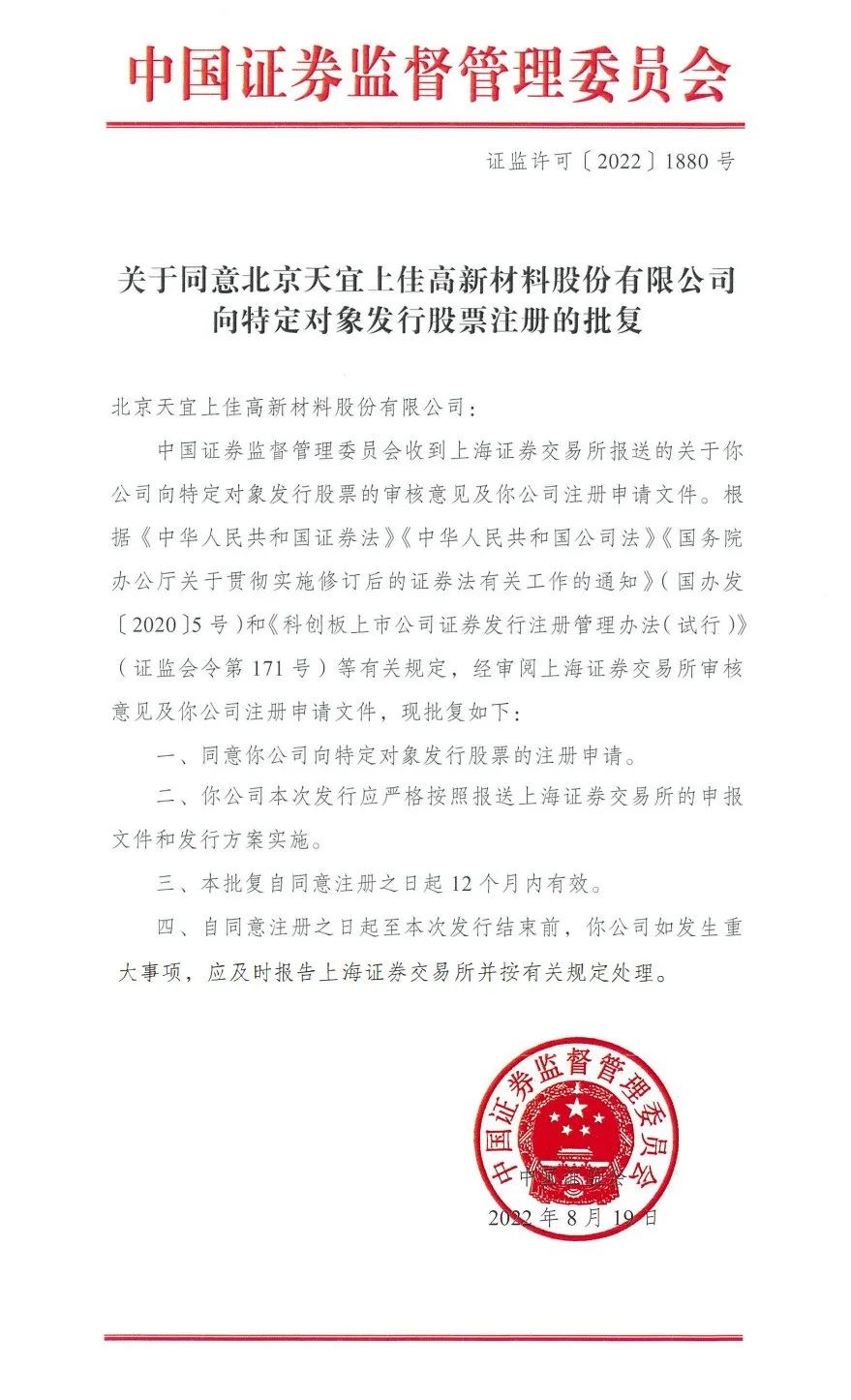 2022年8月30日,天宜上佳收到中國證監(jiān)會出具的《關(guān)于同意北京天宜上佳高新材料股份有限公司向特定對象發(fā)行股票注冊的批復(fù)》,公司定增事項正式獲批!
