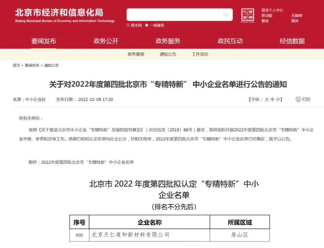 近日,北京市經(jīng)濟(jì)和信息化局官網(wǎng)發(fā)布《關(guān)于對2022年度第四批北京市“專精特新” 中小企業(yè)名單進(jìn)行公告的通知 》,北京天仁道和新材料有限公司成功入選。