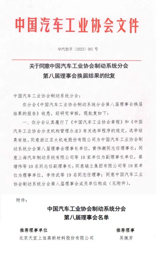 近日,中國(guó)汽車(chē)工業(yè)協(xié)會(huì)制動(dòng)系統(tǒng)分會(huì)第八屆理事會(huì)完成換屆,經(jīng)過(guò)研究審核,中汽協(xié)同意中國(guó)汽車(chē)工業(yè)協(xié)會(huì)制動(dòng)系統(tǒng)分會(huì)第八屆理事會(huì)成員單位構(gòu)成,北京天宜上佳高新材料股份有限公司等19家公司當(dāng)選理事單位,天宜上佳董事長(zhǎng)吳佩芳等19名同志擔(dān)任理事。